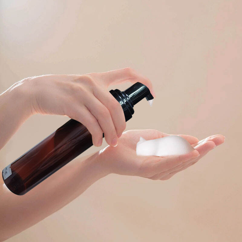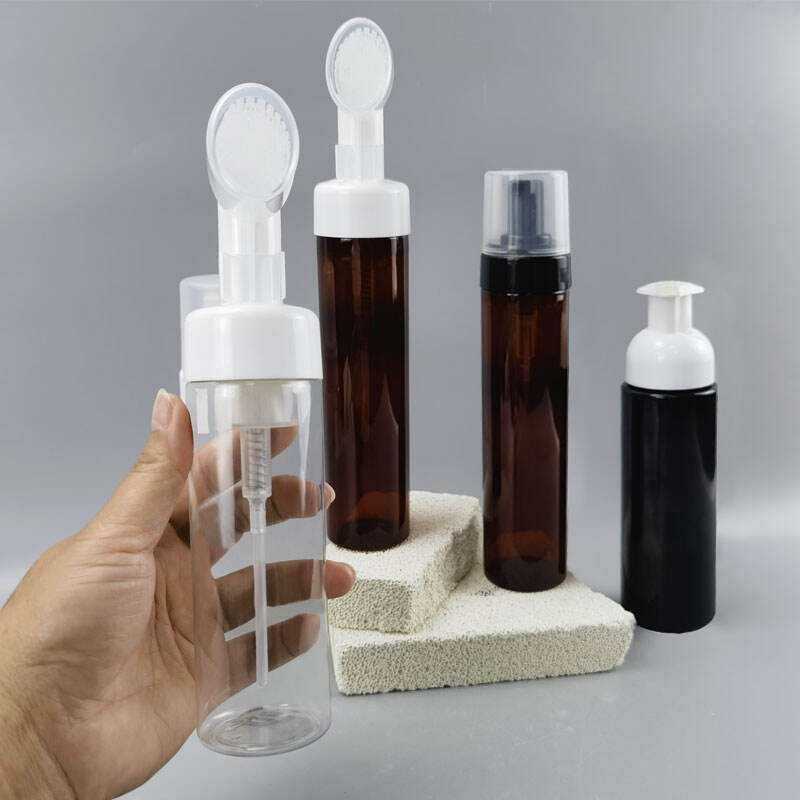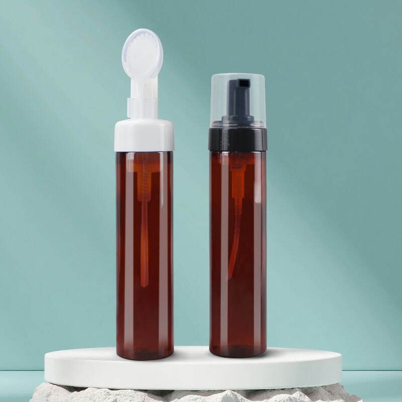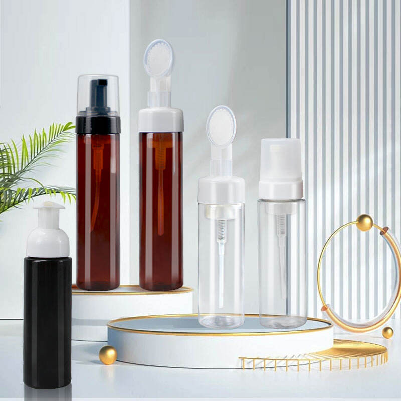 These bottles are made of 100% PET raw material. The current colors are transparent and amber. The amber color can effectively protect the photosensitive formula. The top is equipped with an accurate foaming press pump head that can evenly distribute foam and lotion types. The two-in-one design comes with an additional soft silicone brush, which can store lotion and clean the facial skin area It can effectively remove dirt.