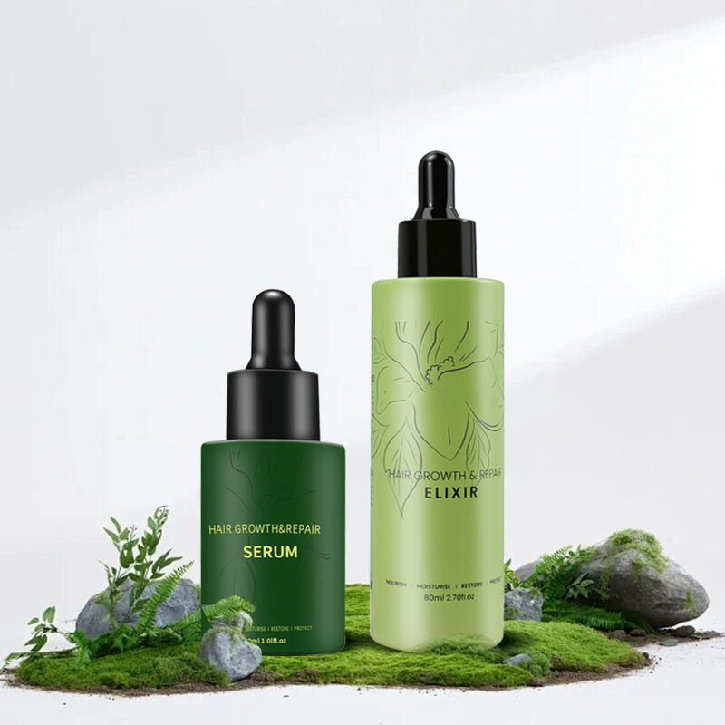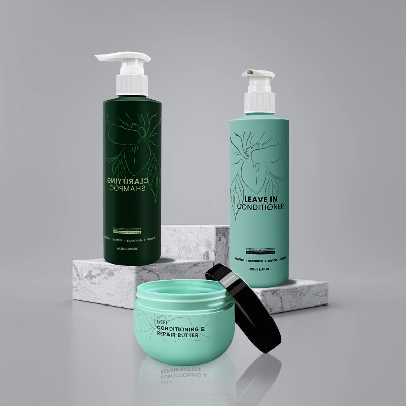 ZH-1228 is a set of plastic cosmetic packaging kits, including shampoo and conditioner pump bottles, Dropper Bottle and Cream Jar. The entire set of products is mainly in different shades of green, with a natural and soothing texture. It is positioned to meet the demand for gentle and natural plastic packaging for hair and skin care.